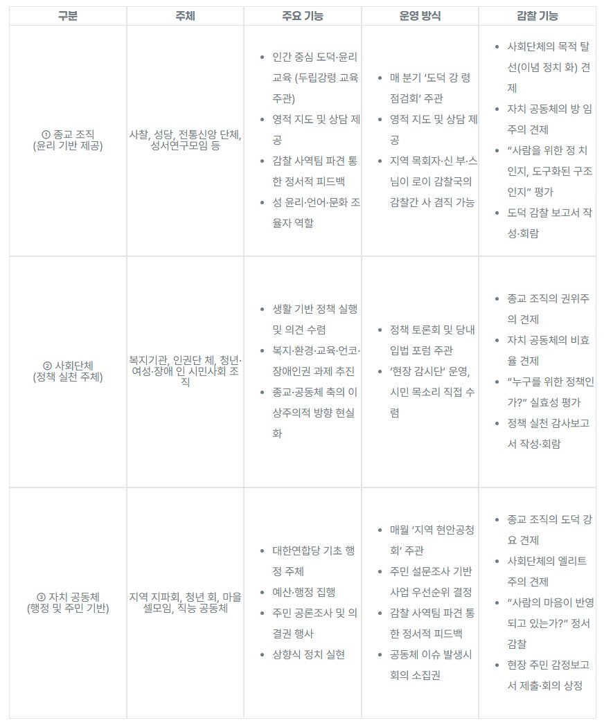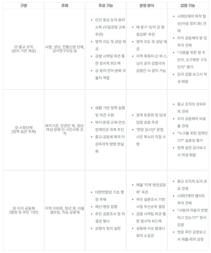 대한연합당의 삼각운영구조는 권력이 특정 집단에 집중되는 것을 방지하고, 도덕·정책·실천의 균형을 이 루어 국민 여러분과 함께하는 민주적 참여와 공동체 윤리를 구현하는 것을 목적으로 두고 있습니다. 종교 조직은 성경적 가치와 전통종교의 교훈을 바탕으로 도덕과 윤리의 기준을 제공하며, 사회단체는 민 생·복지·환경·교육 등 국민 생활과 직결되는 정책을 실질적으로 실행합니다. 또한 자치 공동체는 주민 여러 분의 의견을 직접 수렴하고 행정과 예산을 집행함으로써 생활정치를 실현합니다. 세 축은 독립적으로 기능하면서도 서로를 감찰합니다. 종교 조직은 사회단체가 목적에서 벗어나지 않도 록 견제하고, 사회단체는 종교적 권위주의와 공동체의 비효율을 감시하며, 자치 공동체는 주민들의 마음과 정서를 반영하여 종교의 도덕 강요와 사회단체의 엘리트주의를 견제합니다. 이러한 삼각운영구조를 통해 대한연합당은 국민 여러분의 신뢰를 바탕으로 투명한 정치를 실현하고, 약 자를 포용하는 민생 정책을 강화하며, 생활권에 뿌리내린 주민 참여 민주주의를 실현하겠습니다. 나아가 사회적 갈등을 줄이고 국민 통합과 공동체 회복을 이루어내겠습니다.